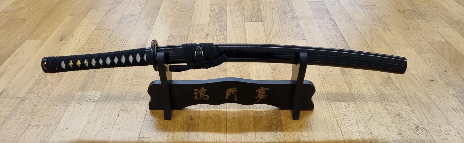 The blade is fullered to reduce weight. The tsuka is made of wood, lined with real ray skin and wrapped in black cotton. Two mekugis (bamboo dowels) are attached to the handle. This sword is fully demountable and finely sharpened, great for cutting tests.