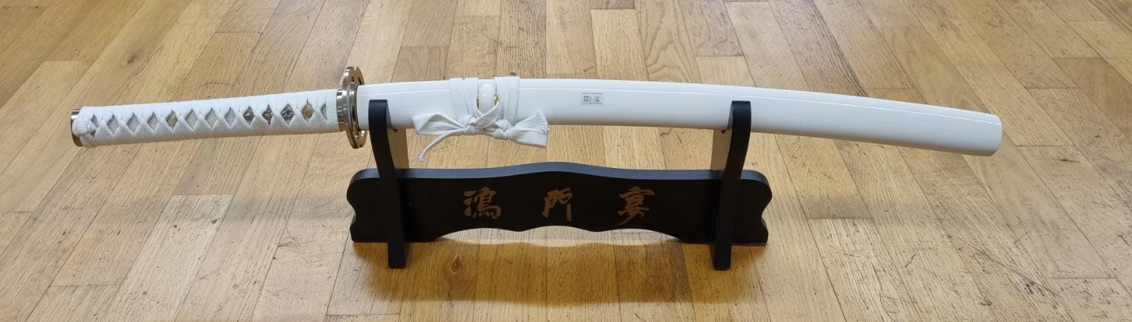 The blade is fullered to reduce weight. The tsuka is made of wood, lined with real ray skin and wrapped in black cotton. Two mekugis (bamboo dowels) are attached to the handle. This sword is fully demountable and finely sharpened, great for cutting tests.