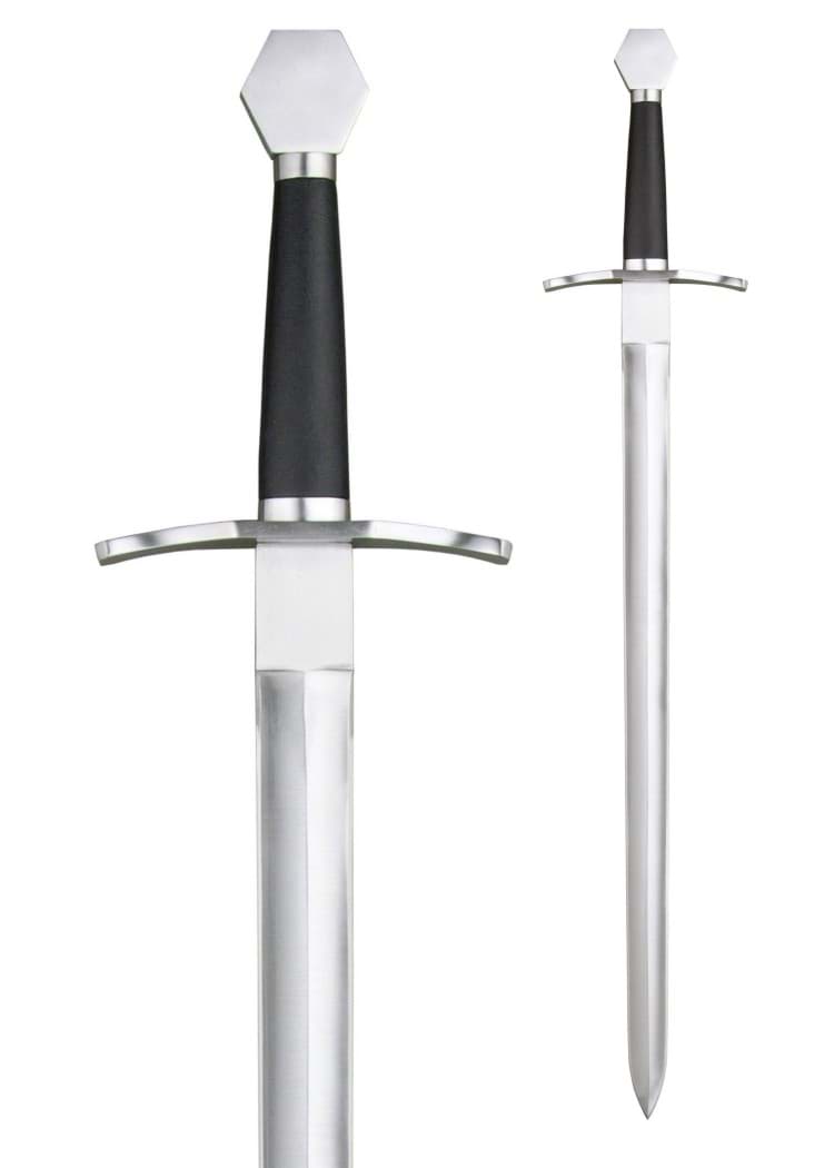This Sword is forged from High Carbon Steel, it has a Peened Pommel and a lovely wooden leather wrapped scabbard. Specifications: Overall: approx. 90 cm Blade Length: approx. 70 cm Handle Length: approx. 20 cm Weight: approx. 1.130 kg