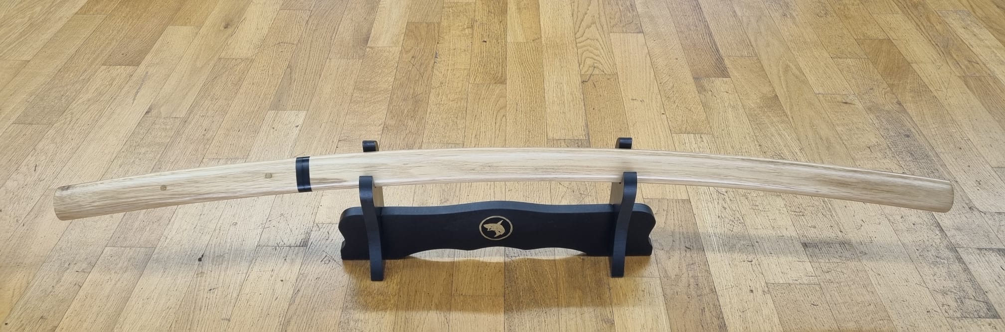 The blade is fullered to reduce the weight. The tsuka is made of wood, lined with real ray skin and wrapped with cotton lacing. Two mekugis (bamboo dowels) are attached to the handle. This katana is fully demountable and sharpened making this perfect for cutting tests.