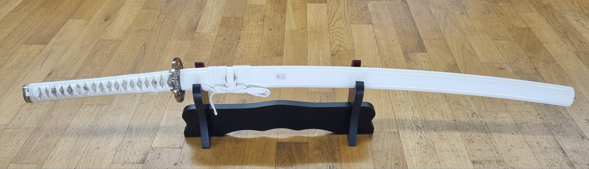 The blade is fullered to reduce the weight. The tsuka is made of wood, lined with real ray skin and wrapped with cotton lacing. Two mekugis (bamboo dowels) are attached to the handle. This katana is fully demountable and sharpened making this perfect for cutting tests.