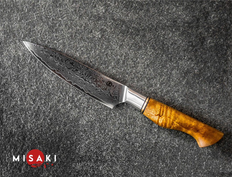 **Acier Damas avec 67 couches.** L'aspect attrayant de l'acier Damas provient de la technique complexe de pliage et de soudage, qui donne lieu à un motif de grain distinctif, tandis que le processus de durcissement unique de Misaki confère aux lames un tranchant et une durabilité exceptionnels. **Poignée ergonomique en érable sycomore fin.** Le manche méticuleusement conçu de Misaki, en érable sycomore grainé, s'adapte parfaitement à la main, garantissant une prise en main sûre. Un polissage répété accentue le motif de couleur ambre avec une beauté exceptionnelle, rendant chaque couteau véritablement unique en son genre. **Certifié en Suisse.** Nous accordons une grande importance à la qualité et, en tant que tel, chacun des couteaux exquis de Misaki est soumis à des mesures de contrôle de qualité supplémentaires rigoureuses avant expédition. Cet engagement envers la qualité est réaffirmé à travers un certificat marqué à la main qui accompagne notre emballage élégant.